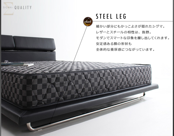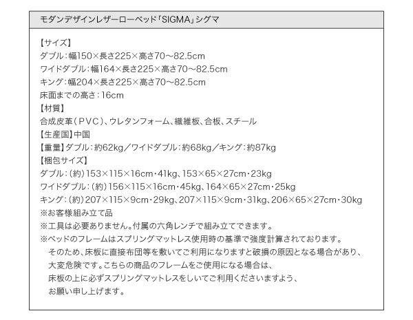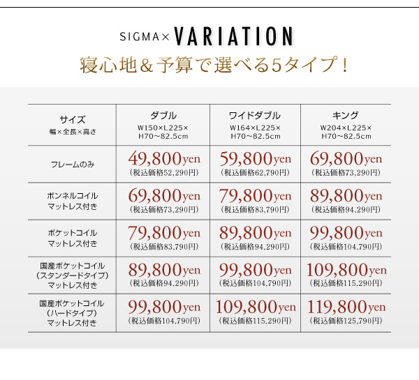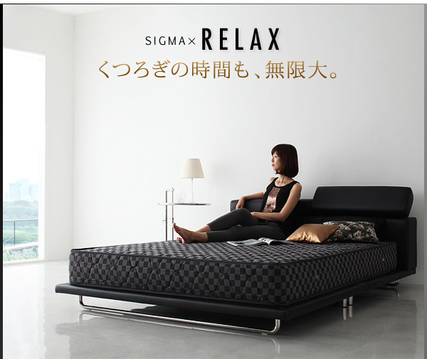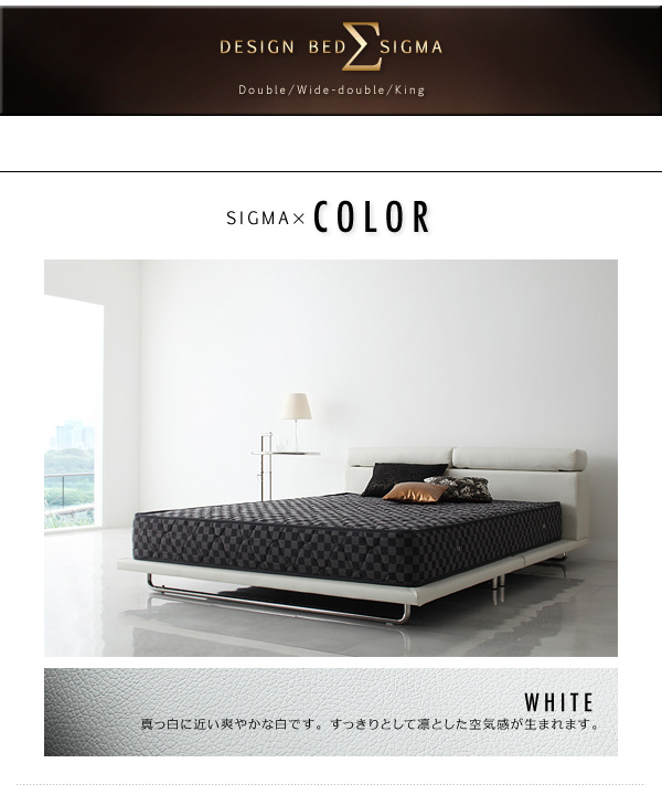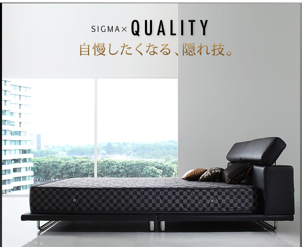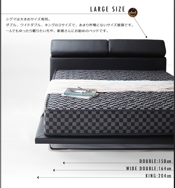 シグマは大きめサイズ専用。ダブル、ワイドダブル、キングの3サイズで、あまり市場にないサイズ展開です。一人でもゆったり眠りたい方や、新婚さんにもお勧めのベッドです。