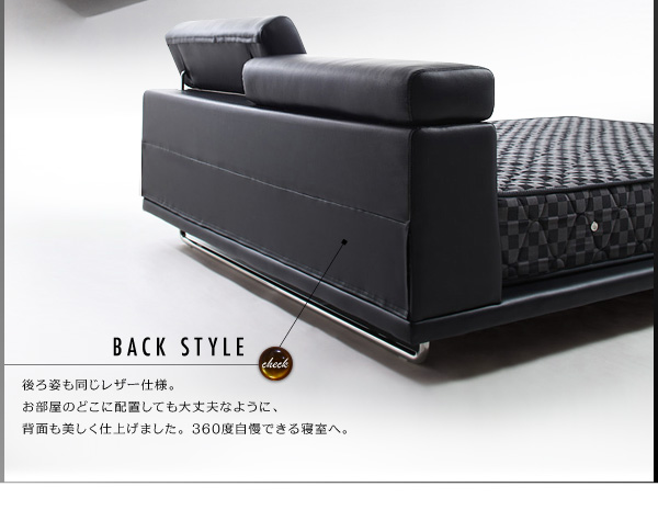 後ろ姿も同じレザー仕様。お部屋のどこに配置しても大丈夫なように、背面も美しく仕上げました。360度自慢できる寝室へ。