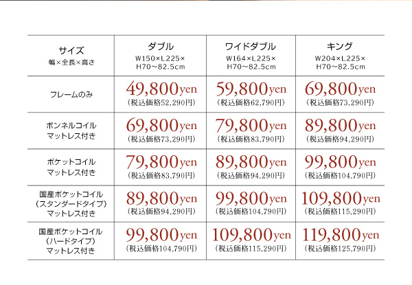 キング:幅204×長さ225×高さ70〜82.5cm