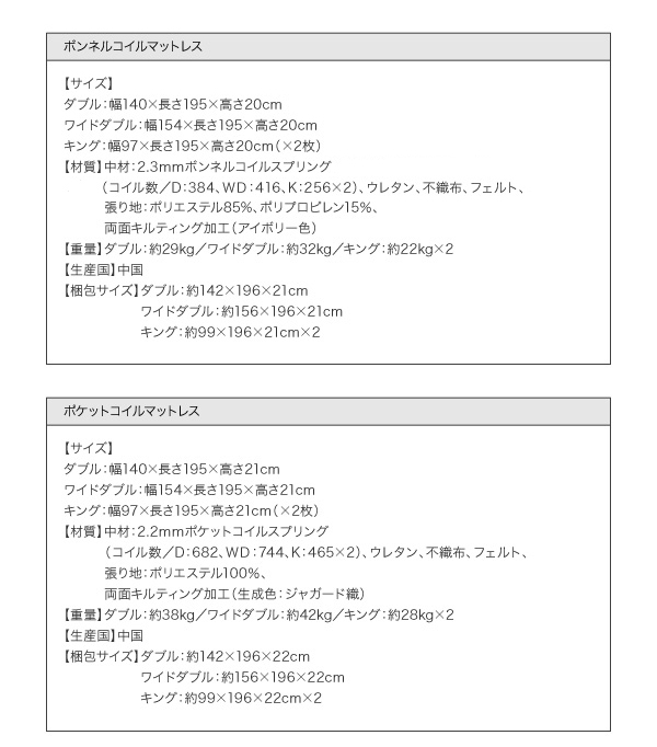 中材:2.3mmボンネルコイルスプリング(コイル数/D:384、WD:416、K:256×2)、、ウレタン、不織布、フェルト