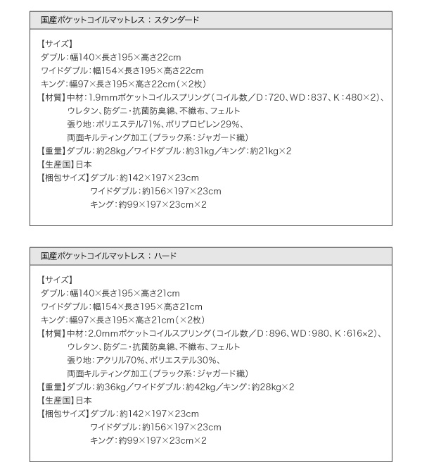 中材:2.0mmポケットコイルスプリング(コイル数/D:896、WD:980、K:616×2)、ウレタン、防ダニ・抗菌防臭綿、不織布、フェルト