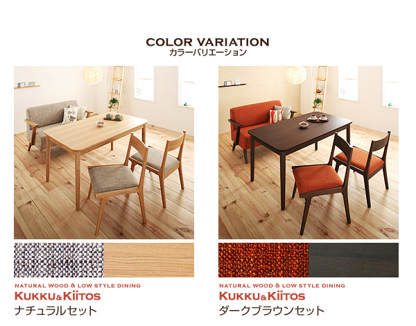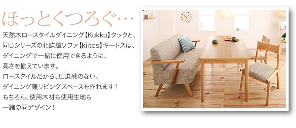 天然木ロースタイルダイニング【kukku】クックと、同じシリーズの北欧風ソファ「キートス」は、ダイニングで一緒に使用できるように、高さを揃えています。ロースタイルだから、圧迫感のない、ダイニング兼リビングスペースを作れます!もちろん、使用木材も使用生地も一緒の同デザイン!