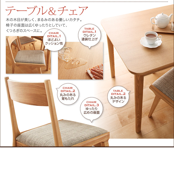 木の木目が美しく、まるみのある優しいカタチ。椅子の座面は広くゆったりとしていて、くつろぎのスペースに。