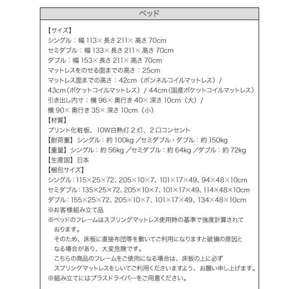 注意※ベッドのフレームはスプリングマットレス使用時の基準で強度計算されております。そのため、床板に直接布団等を敷いてご利用になりますと破損の原因となる場合があり、大変危険です。こちらの商品のフレームをご使用になる場合は、床板の上に必ずスプリングマットレスをしいてご利用くださいますよう、お願い申し上げます。