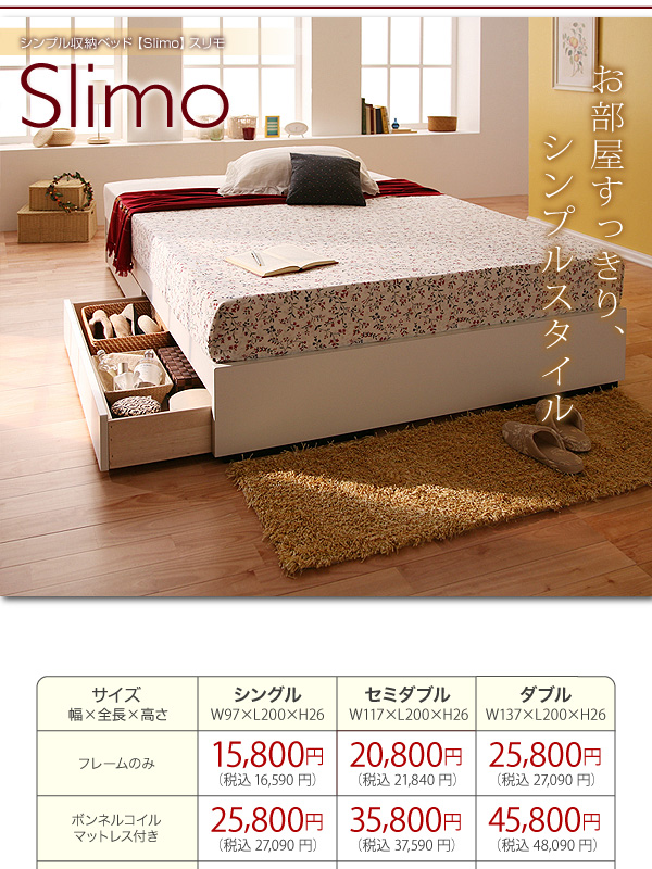 ヘッドボードがないすっきりとしたデザインが特徴!お部屋の半分をしめるベッドはできるだけシンプルがいいですよね。狭いお部屋でもベッドを置きたい人にもぴったりのSlimoです。