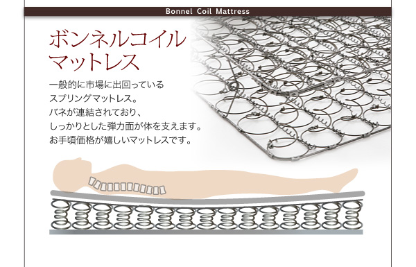 一般的に市場に出回っているスプリングマットレス。バネが連結されており、しっかりとした弾力面が体を支えます。お手頃価格が嬉しいマットレスです。