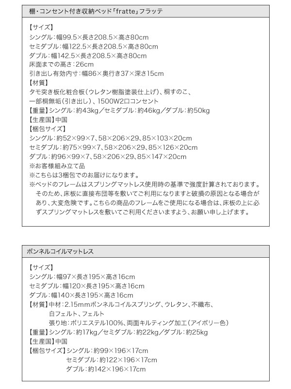 ※ベッドのフレームはスプリングマットレス使用時の基準で強度計算されております。そのため、床板に直接布団等を敷いてご利用になりますと破損の原因となる場合があり、大変危険です。こちらの商品のフレームをご使用になる場合は、床板の上に必ずスプリングマットレスを敷いてご利用くださいますよう、お願い申しあげます。