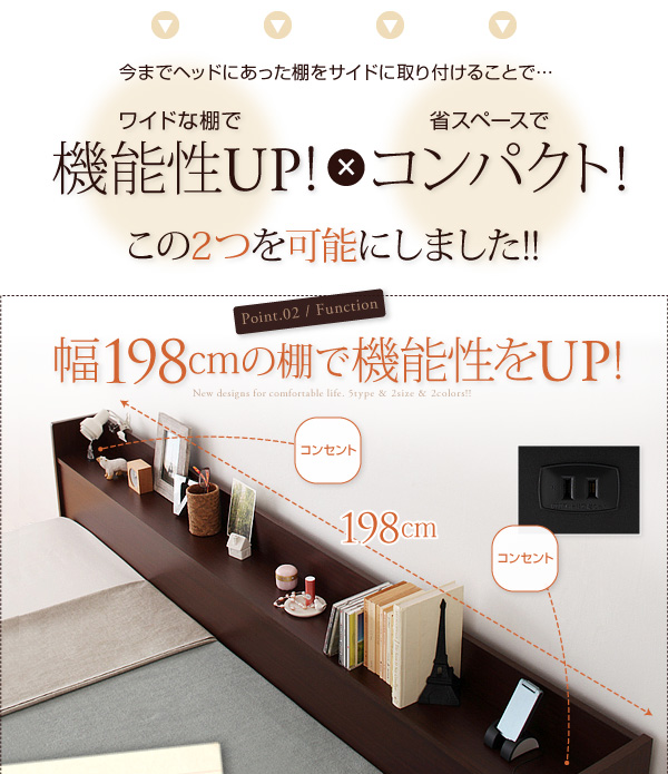 幅198cmのワイドな棚が自由度を高めます!ヘッドにある場合と比べても、シングルサイズで約2倍の長さ。コンセントも両サイドに1個づつ付いています。本やCD、携帯はもちろん、音楽プレーヤーも置ける機能的な棚であなた仕様に!