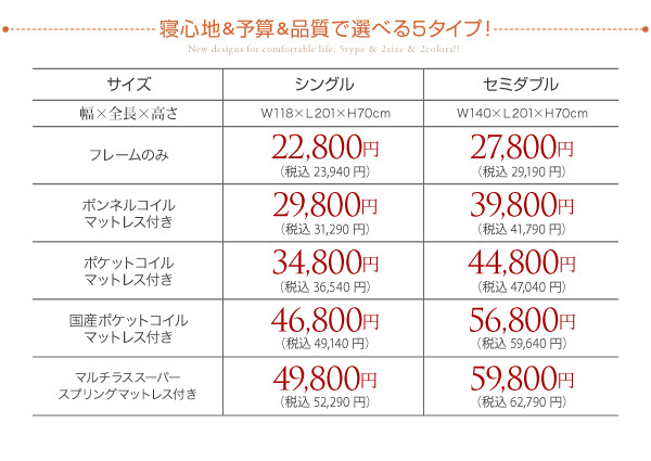 シングル:49800円(税込52290)、セミダブル:59800円(税込62790)