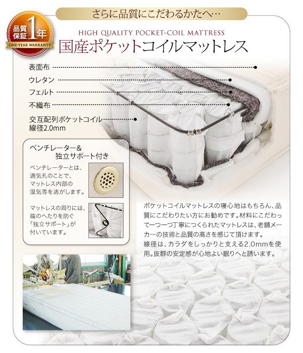 日本製ポケットコイルマットレスをご用意【1年間保証】