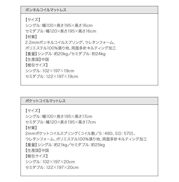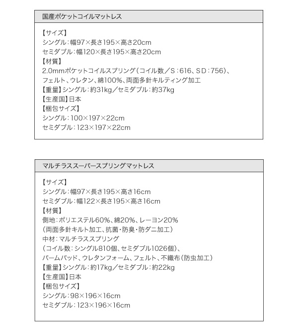 中材:マルチラススプリング(コイル数:シングル810個、セミダブル1026個)、パームパッド、ウレタンフォーム、フェルト、不織布(防虫加工)