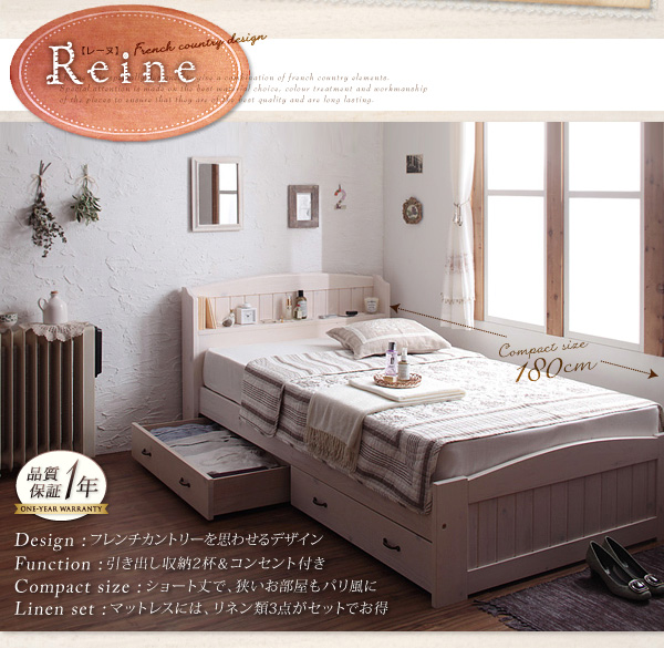 かわいくても、機能的でなければ、意味がありません。レーヌは本や、目覚まし時計などを置ける棚に、2口コンセントがついて、携帯の充電もここでできます。また、ベッド下には、2杯の引き出し付き。リネン類や、薄手の洋服などはここにしまって。キャスター付きで移動もラクラク。