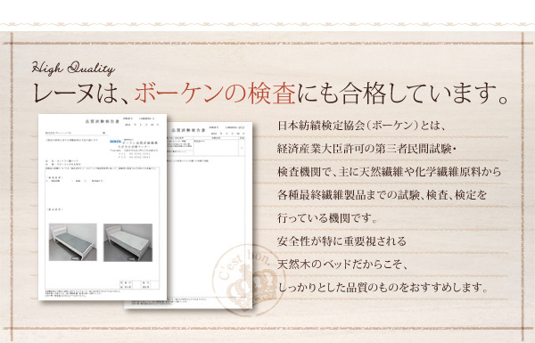 日本紡績検定協会とは、経済産業大臣許可の第三者民間試験・検査機関で、主に天然繊維や化学繊維原料から各種最終繊維製品までの試験、検査、検定を行っている機関です。安全性が特に重要視されるベッドだからこそ、しっかりとした品質のものをおすすめします。