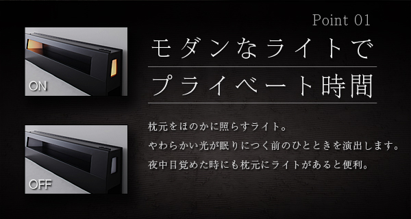 枕元をほのかに照らすライト。やわらかい光が眠りにつく前のひとときを演出します。