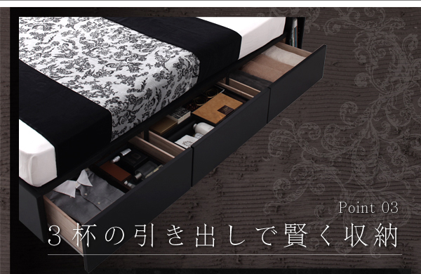 ベッドの下は3杯の引き出し付き。スライドレールで出し入れスムーズ。
