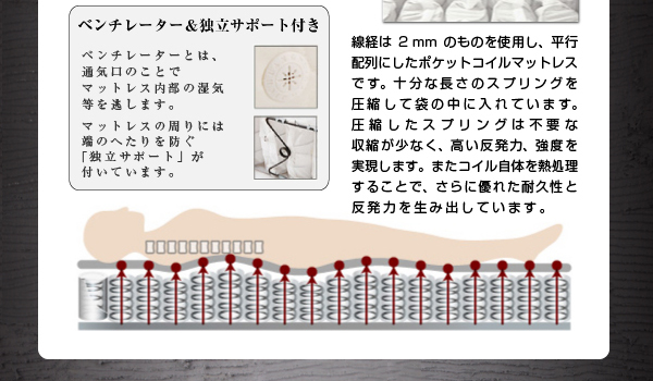 ※独立サポート付き/マットレスの周りには、端のへたりを防ぐ「独立サポート」が付いています。