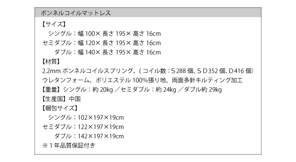 【重量】シングル:約31kg/セミダブル:約37kg/ダブル約43kg