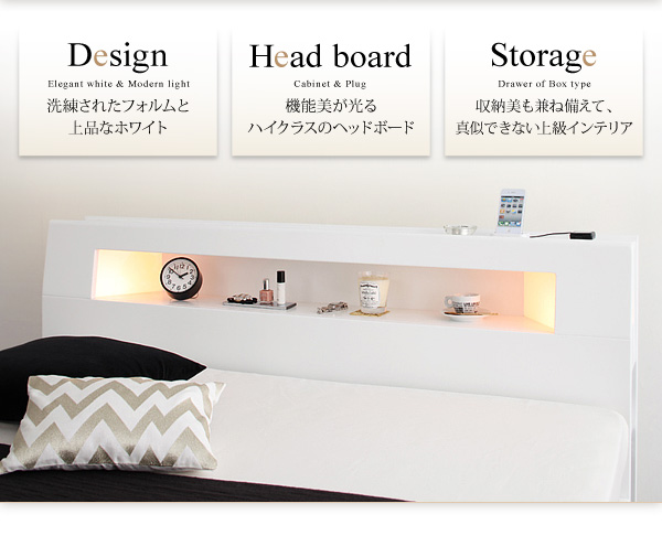 デザインだけでなく、機能も充実したヘッドボード。本や携帯など、ベッド周りに必要なものが棚に置けてスッキリ整理できます。
