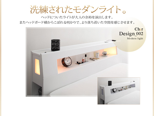 ヘッドについたライトが大人の余裕を演出します。またヘッドボード横からこぼれる明かりで、より落ち着いた空間を感じさせます。
