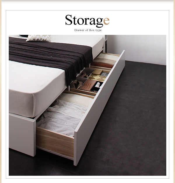 引き出しの反対側も収納可能です。長物や季節ものがしっかりしまえて、ベッド床一面が収納スペースです。
