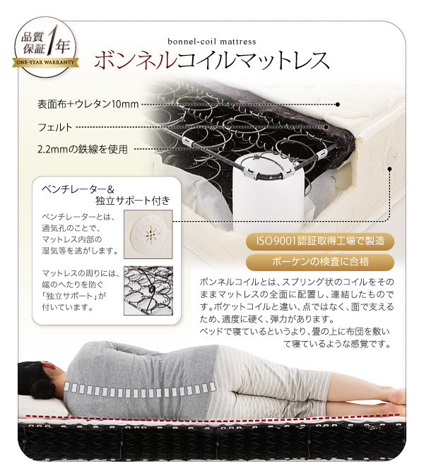 ボンネルコイルとは、スプリング状のコイルをそのままマットレスの全面に配置し、連結したものです。ポケットコイルと違い、点ではなく、面で支えるため、適度に硬く、弾力があります。ベッドで寝ているというより、畳の上に布団を敷いて寝ているような感覚です。