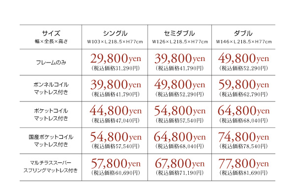 シングル:39800円(税込41790)、セミダブル:49800円(税込52290)、ダブル:59800円(税込62790)