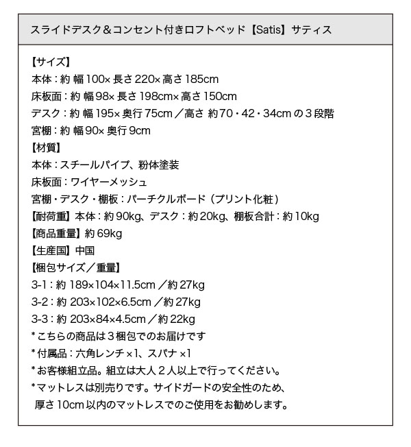 ●スライドデスク&コンセント付きロフトベッド【Satis】サティス●