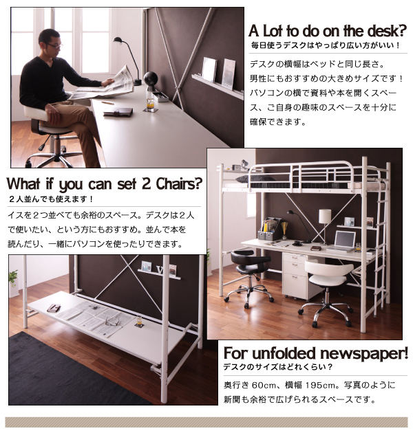 デスクの横幅はベッドと同じ長さ。男性にもおすすめの大きめサイズです!