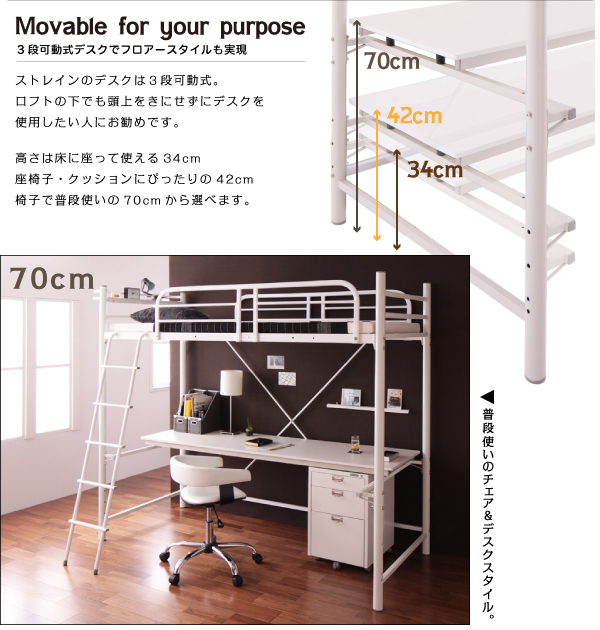 ストレインのデスクは3段可動式。ロフトの下でも頭上をきにせずにデスクを使用したい人にお勧めです。