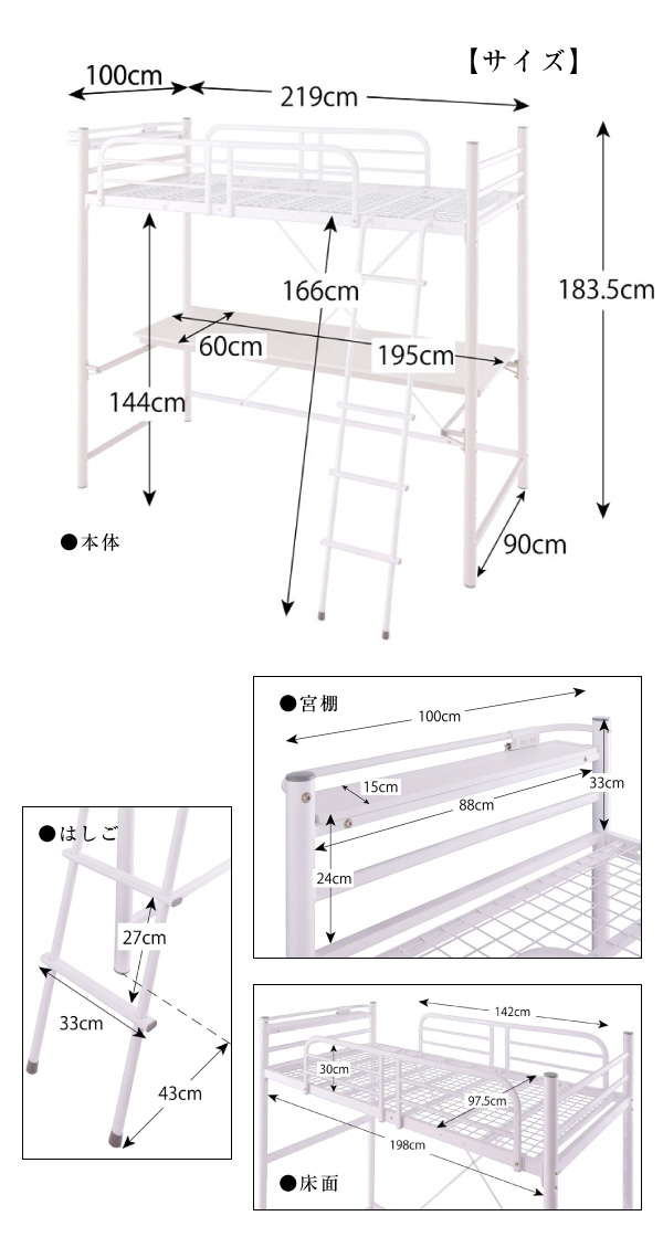 3段可動式!プライベートデスク付き・ロフトベッド