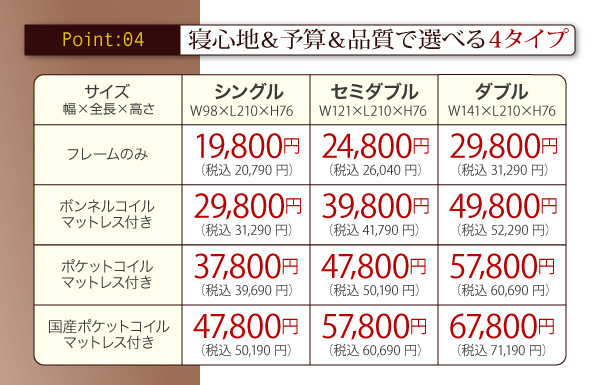 シングル:37800円(税込39690)、セミダブル:47800円(税込50190)、ダブル:57800円(税込60690)