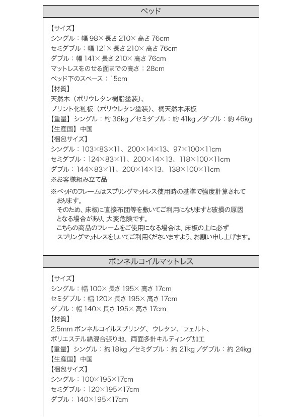 シングル:47800円(税込50190)、セミダブル:57800円(税込60690)、ダブル:67800円(税込71190)