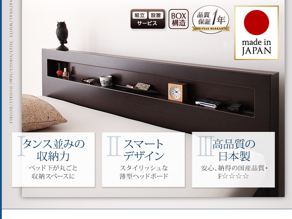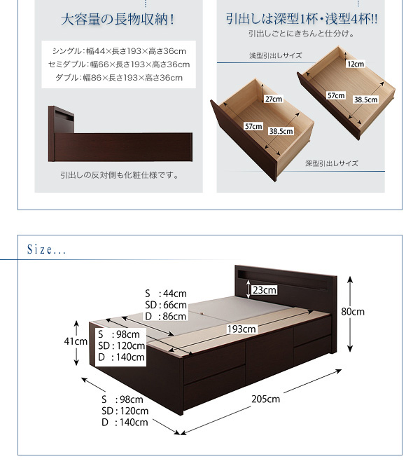 長物収納:シングル (約)幅44×長さ193×深さ36cm 、セミダブル (約)幅66×長さ193×深さ36cm 、ダブル (約)幅86×長さ193×深さ36cm