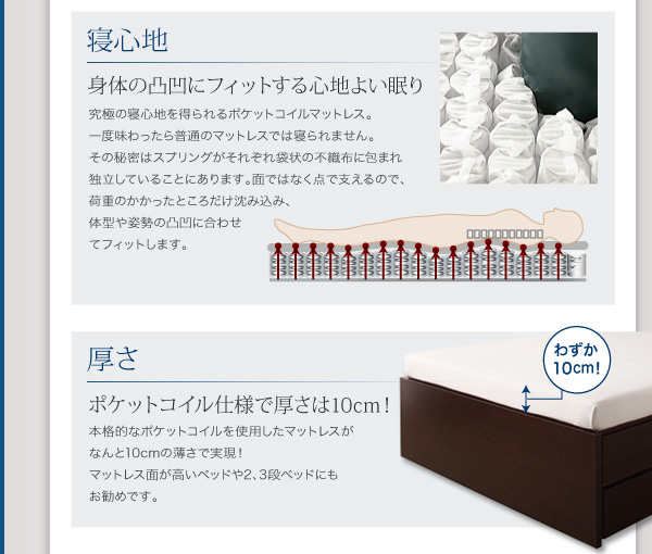 本格的なポケットコイルを使用したマットレスがなんと10cmの薄さで実現!マットレス面が高いベッドや2、3段ベッドにもお勧めです。