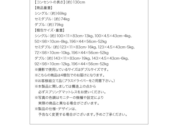 【商品重量】シングル:約12kg、セミダブル:約15kg、ダブル:約18kg