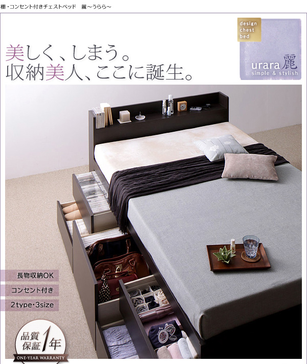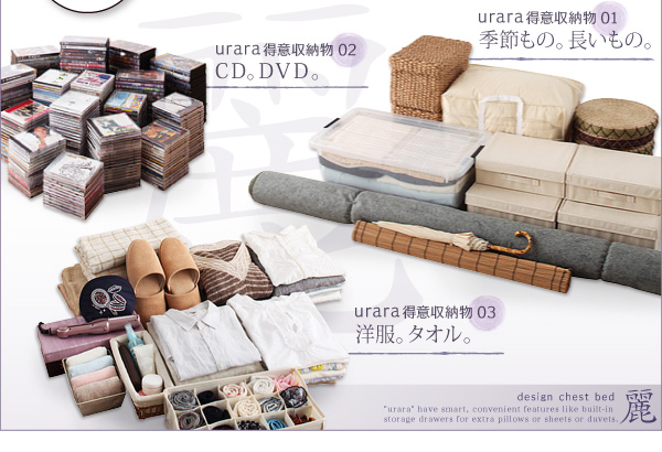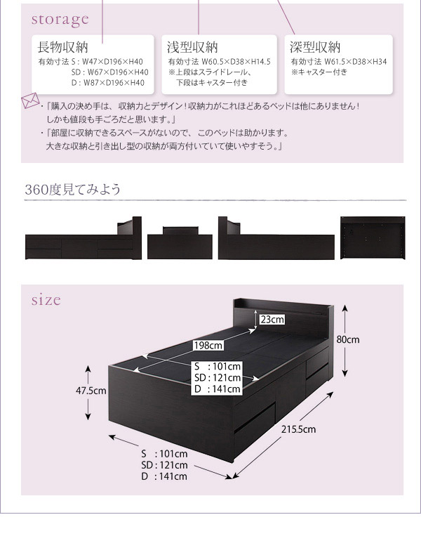 ベッドの下はすべて収納スペース。押し入れ収納がないお部屋や狭いお部屋をスペース活用するのにぴったりのベッドです。