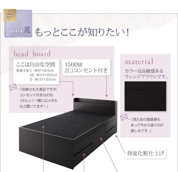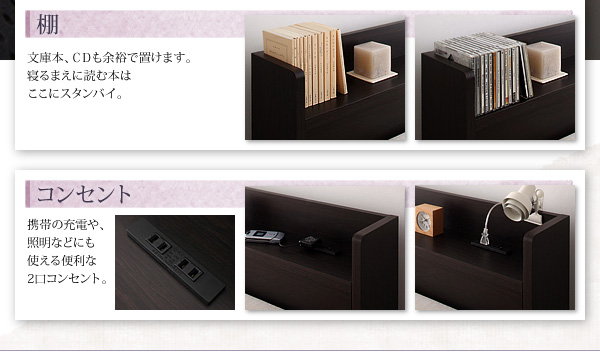 ヘッドボードは、ベッド周りの小物を余裕で置ける広さ。文庫本や、CD、メガネや目覚まし時計はここにひとまとめに。2口コンセント付きで携帯の充電などもここで出来る便利さがポイント。