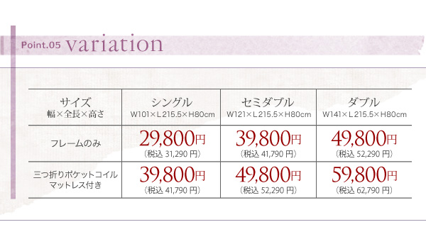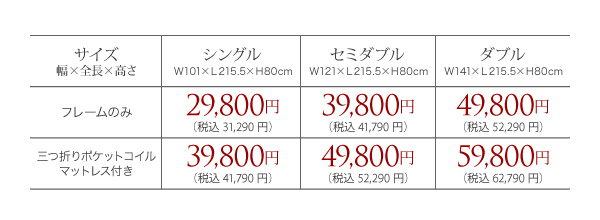 シングル:39.800円(税込41790円)、セミダブル:49.800円(税込52290円)、ダブル:59.800円(税込62790円)