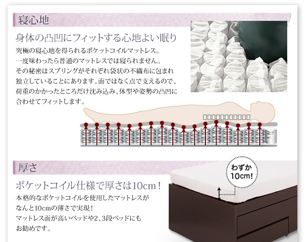 本格的なポケットコイルを使用したマットレスがなんと10cmの薄さで実現!マットレス面が高いベッドや2、3段ベッドにもお勧めです。