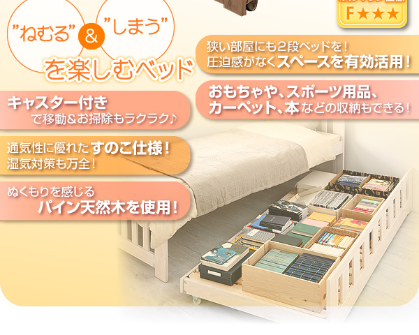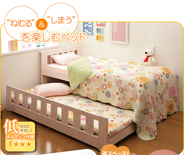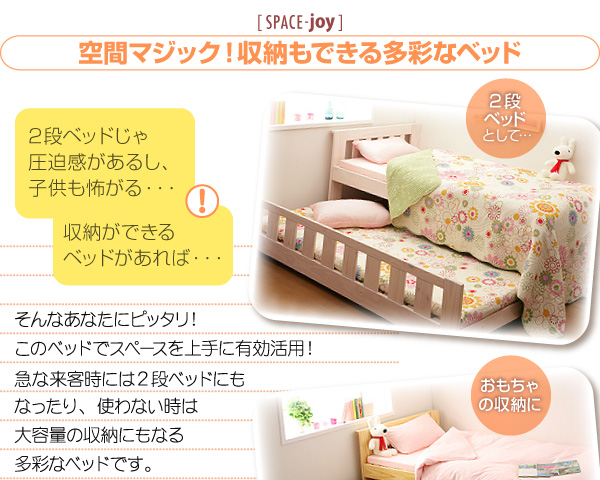 2段ベッドじゃ圧迫感があるし、子供も怖がる・・・収納ができるベッドがあれば・・・そんなあなたにピッタリ!このベッドでスペースを上手に有効活用!急な来客時には2段ベッドにもなったり、使わない時は大容量の収納にもなる多彩なベッドです。