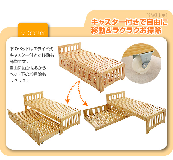 下のベッドはスライド式。キャスター付きで移動も簡単です。自由に動かせるから、ベッド下のお掃除もラクラク♪