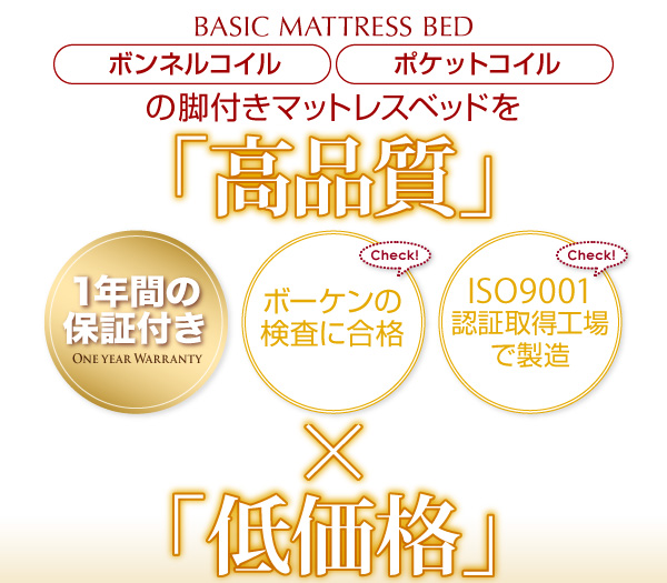 ベーシックポケットコイルマットレスベッドは、ISO9001認証取得工場で製造。国産基準規格であるISO9001:2008を取得、国際的に保証されています。