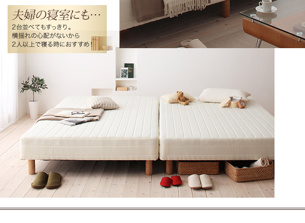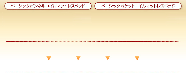 ボンネルコイルとは、スプリング状のコイルをそのままマットレスの全面に配置し、連結したものです。ポケットコイルと違い、点ではなく、面で支えるため、適度に硬く、弾力性に優れています。ベッドで寝ているというより、畳の上に布団を敷いて寝ているような感覚でしっかりとした寝心地が特徴です。