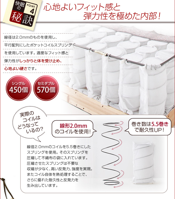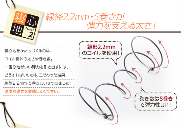 寝心地をかたちづくるのは、コイル自体の太さや巻き数。一番心地がいい弾力を引き出すには、どうすればいいかにこだわった結果、線径2.2mm・5巻きにいきつきました!適度な硬さを実感してください。