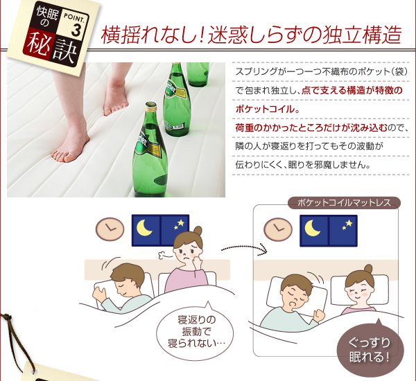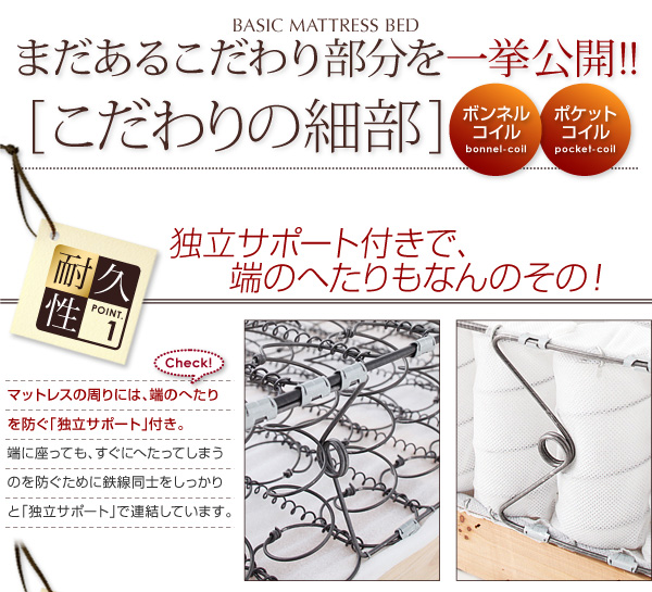 マットレスの周りには、端のへたりを防ぐ「独立サポート」付き。端に座っても、すぐにへたってしまうのを防ぐために鉄線同士をしっかりと「独立サポート」で連結しています。