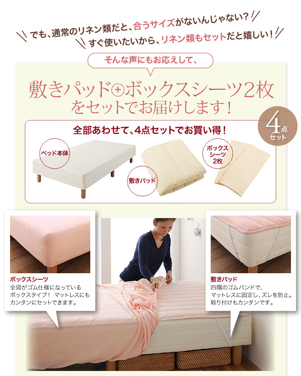 全部あわせて、4点セットでお買い得!/ベッド本体・敷きパッド・ボックスシーツ2枚
