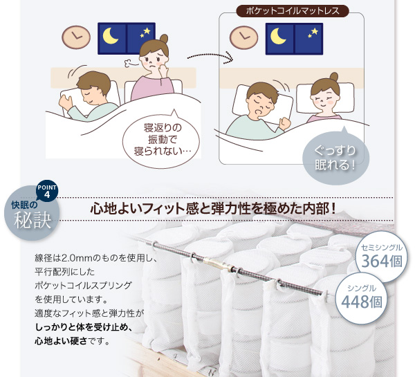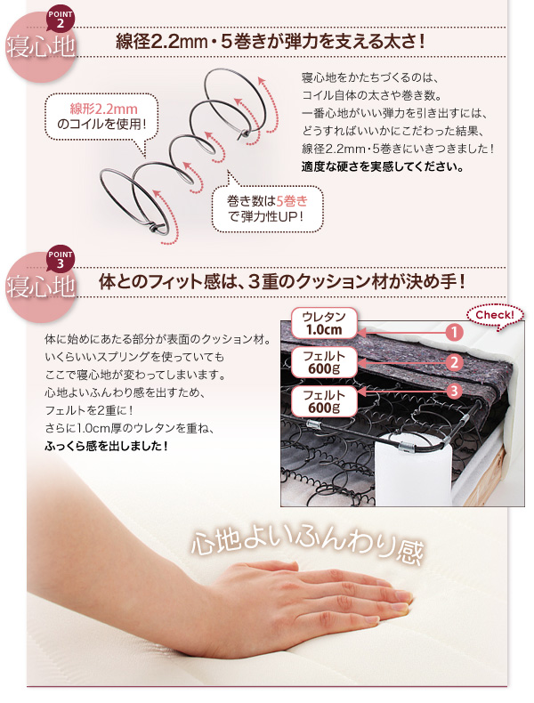 寝心地をかたちづくるのは、コイル自体の太さや巻き数。一番心地がいい弾力を引き出すには、どうすればいいかにこだわった結果、線径2.2mm・5巻きにいきつきました!適度な硬さを実感してください。