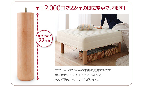 オプション:22cm/オプションで22cmの木脚に変更できます。腰をかけるのにちょうどいい高さで、ベッド下のスペースも広がります。