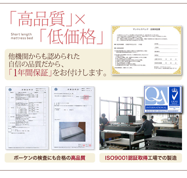 ショート丈マットレスベッドは、ISO9001認証取得工場で製造。国産基準規格であるISO9001:2008を取得、国際的に保証されています。