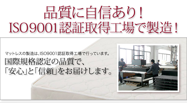 マットレスの製造は、ISO9001認証取得工場で行っています。国際規格認定の品質で、「安心」と「信頼」をお届けします。